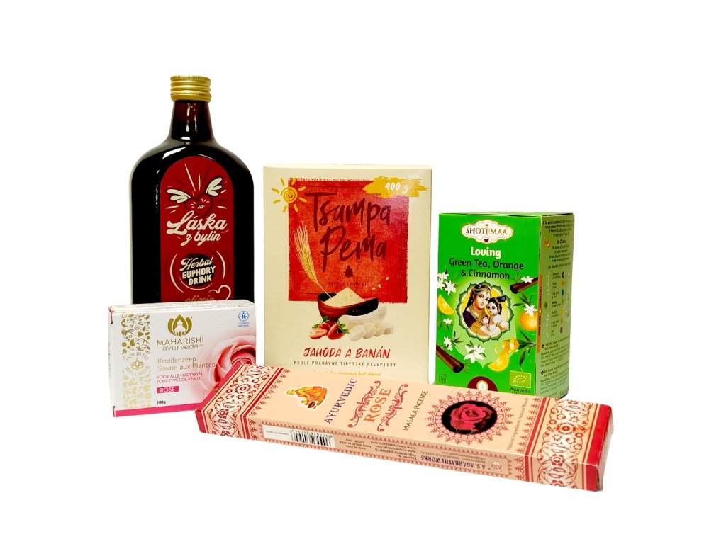Dárkový set plný vůně, chuti a lásky za zvýhodněnou cenu pro vaše milované. Jahodová tsampa, elixír lásky, mýdlo a vonné tyčinky s vůní růže a čaj pro 4, srdeční čakru, je to pravé pro všechny zamilované.