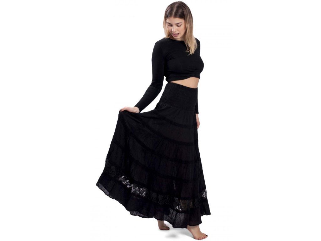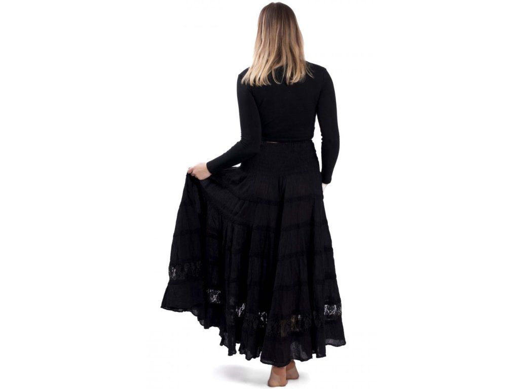 Dlouhá kolová sukně zdobená krajkou černá