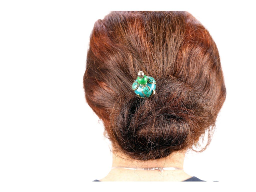 Jehlici nyní překlopte o 180 stupňů směrem k hlavě tak, aby špička směřovala dolů. Tímto pohybem „přehodíte“ horní smyčku drdolu. Při tomto pohybu musíte cítit, že jehlice projíždí těsně u pokožky hlavy (tím zachytíte pevné vlasy, které drdol udrží). Jehlici opatrně protlačte skrz celý drdol až na druhou stranu.