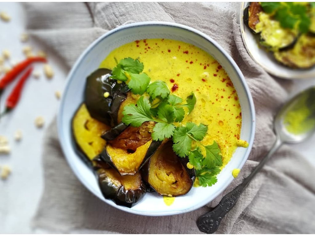 3) Přidejte pečený lilek a na nízký stupeň povařte cca 10 minut. Dle chuti dosolte, posypte čerstvým koriandrem a podávejte s basmati a/nebo plackami čapátí.
