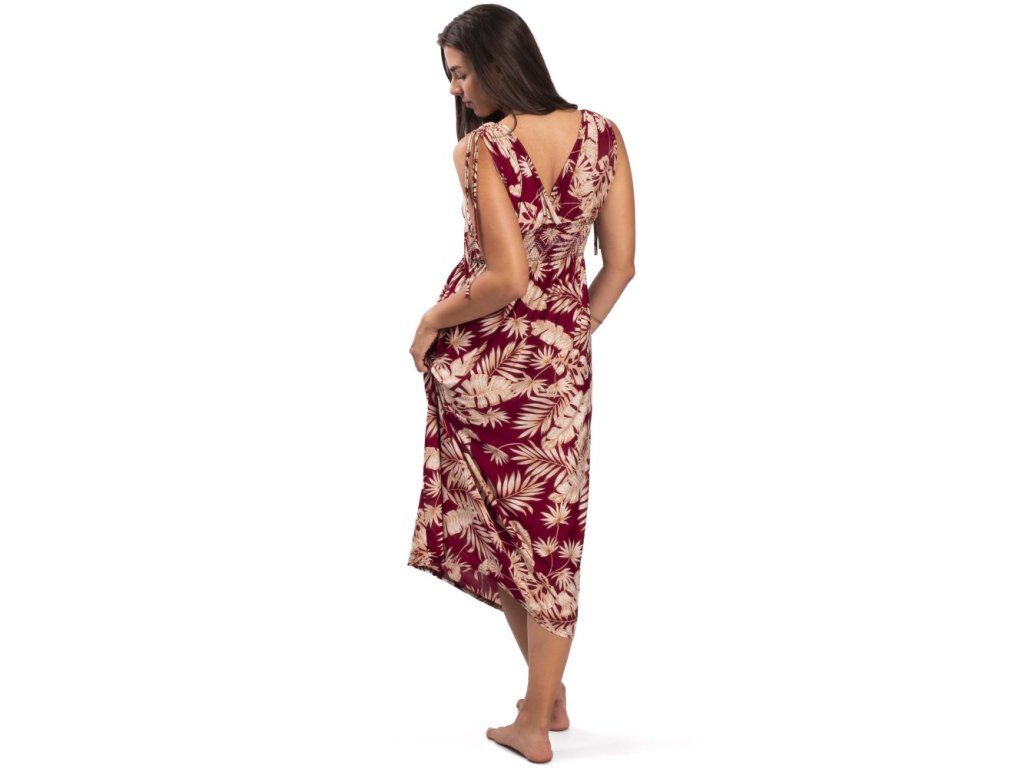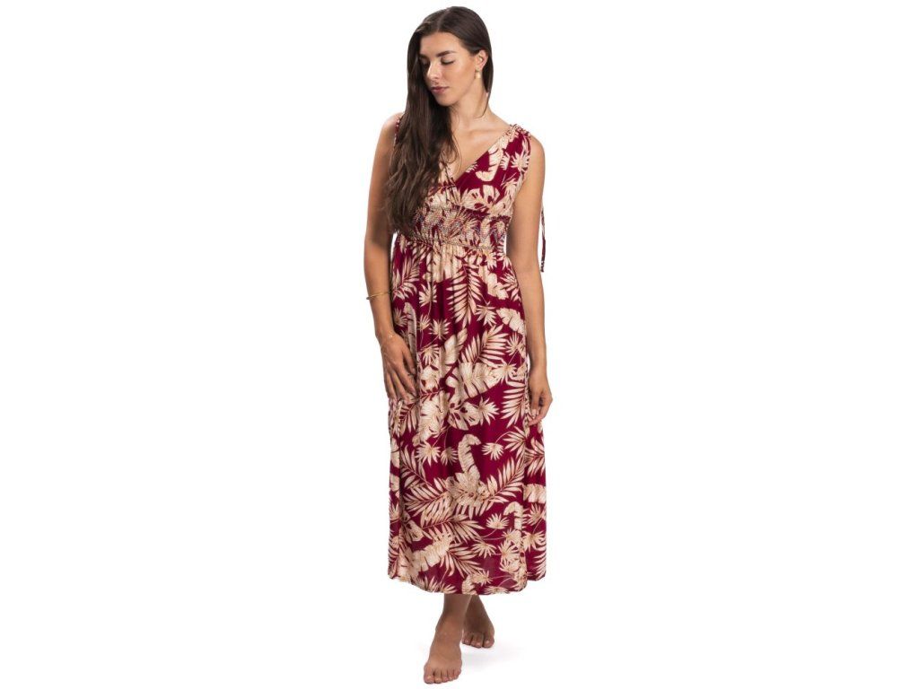 Dlouhé letní šaty s pružným pasem a vzorem listů červené
