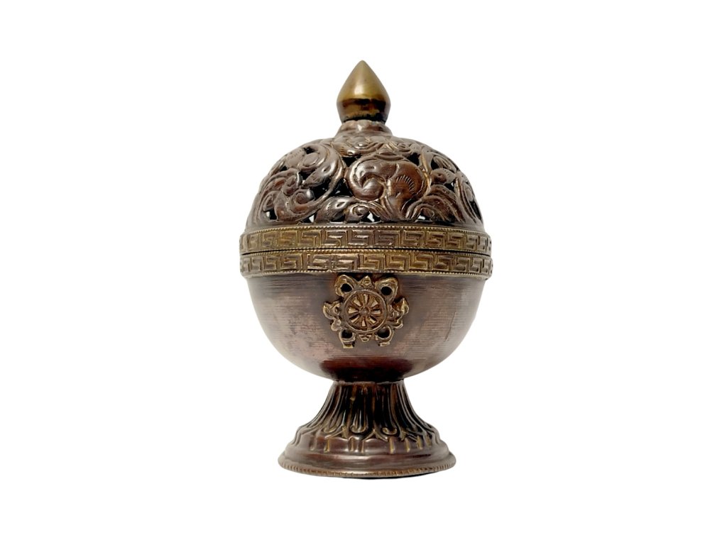 Umně vytvořená kadidelnice ze slitiny kovů s bohatým zdobením a oddělitelným víkem. Kadidelnici lze jednoduše postavit a nechat vykouřit celý prostor svého bytu. Je nicméně vhodné ji používat v dobře větratelném prostoru.
