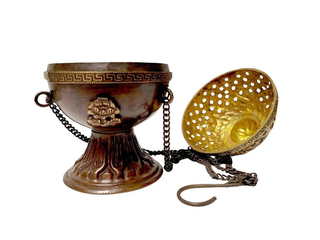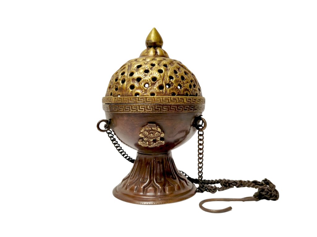 Umně vytvořená kadidelnice ze slitiny kovů s bohatým zdobením a oddělitelným víkem. Kadidelnici lze jednoduše postavit, ale i zavěsit za řetízek. Můžete ji také za řetízek uchopit a přecházet s ní z místnosti do místnosti a mírnými kývavými pohyby vykouřit celý prostor svého bytu. Je nicméně vhodné ji používat v dobře větratelném prostoru.
