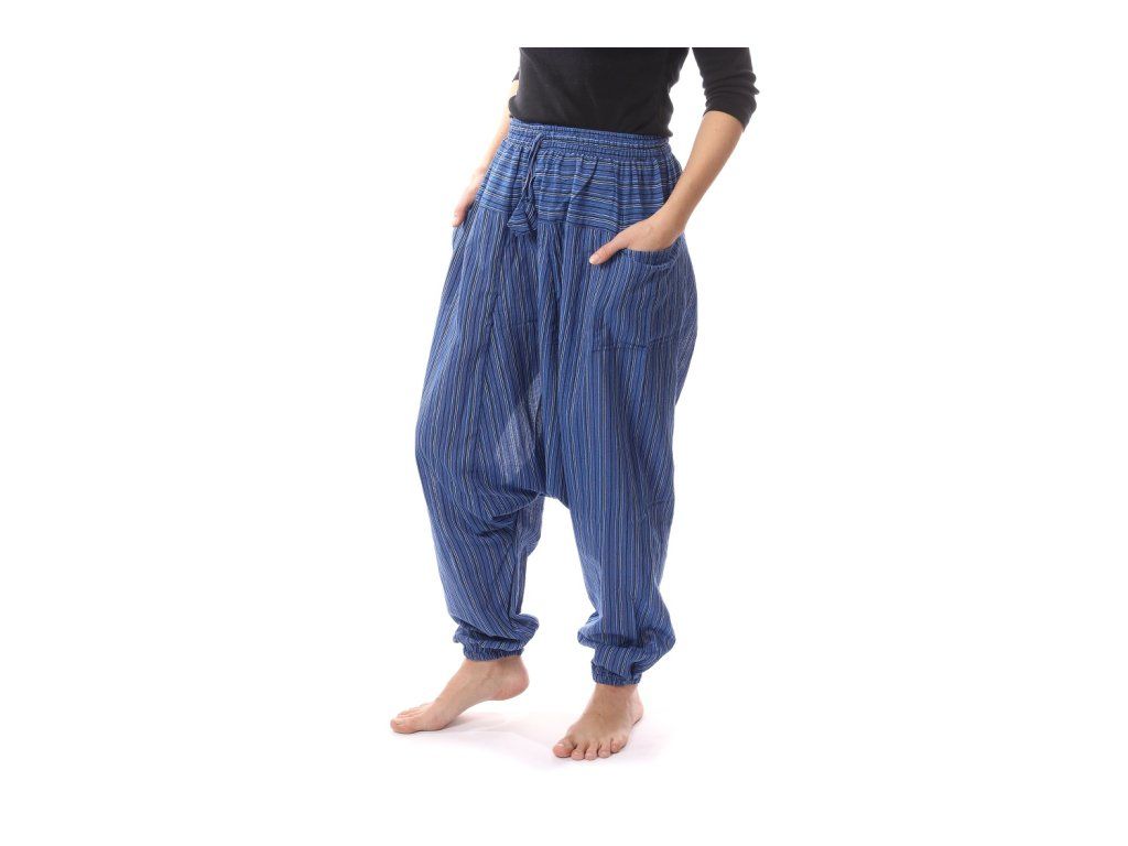 Bavlněné harémky s proužkem – Modré