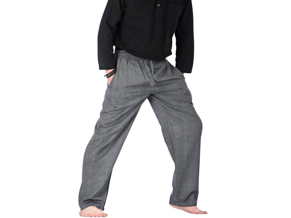 Pánské kalhoty vyrobené z tenké bavlny, jsou velmi lehké a vzdušné. V pase je guma, která se dá stáhnout šnůrkou, ta je stylově zakončena.