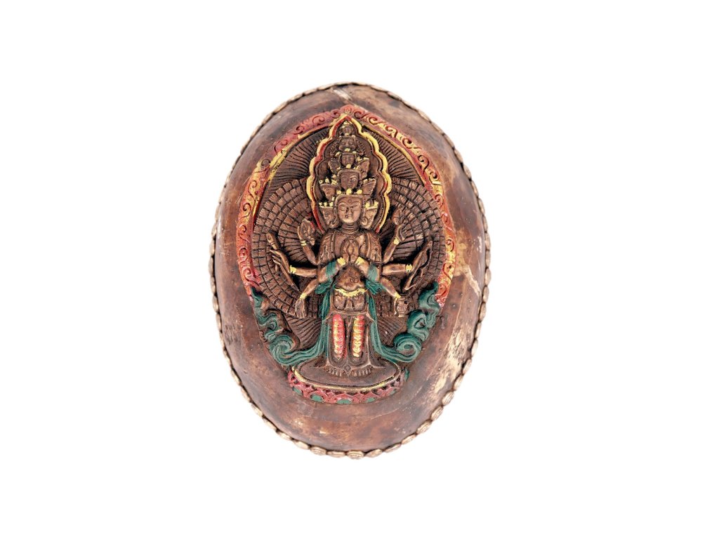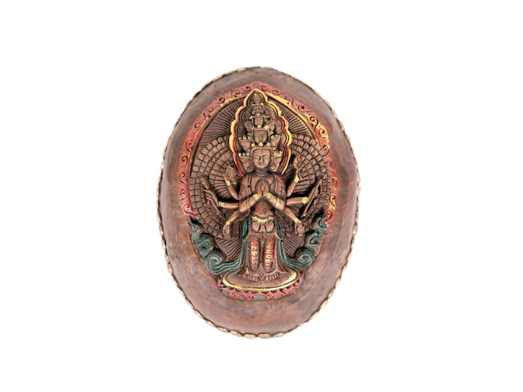 Osm paží představuje osm světových stran (sever, jih, východ, západ, severozápad, severovýchod, jihovýchod, jihozápad). Jedenáct tváří symbolizuje osm světových stran a také tři vertikální směry (nahoru, dolů a doprostřed), Do všech stran bódhisattva nahlíží současně. Hlavy jsou uspořádány do pyramidy. Devět hlav po třech nad sebou je zachyceno v mírumilovné podobě. Desátá hlava nad nimi má rozhněvaný výraz. Jedenáctá hlava umístěná nahoře má podobu pokojného Buddhy Amitábhy.
