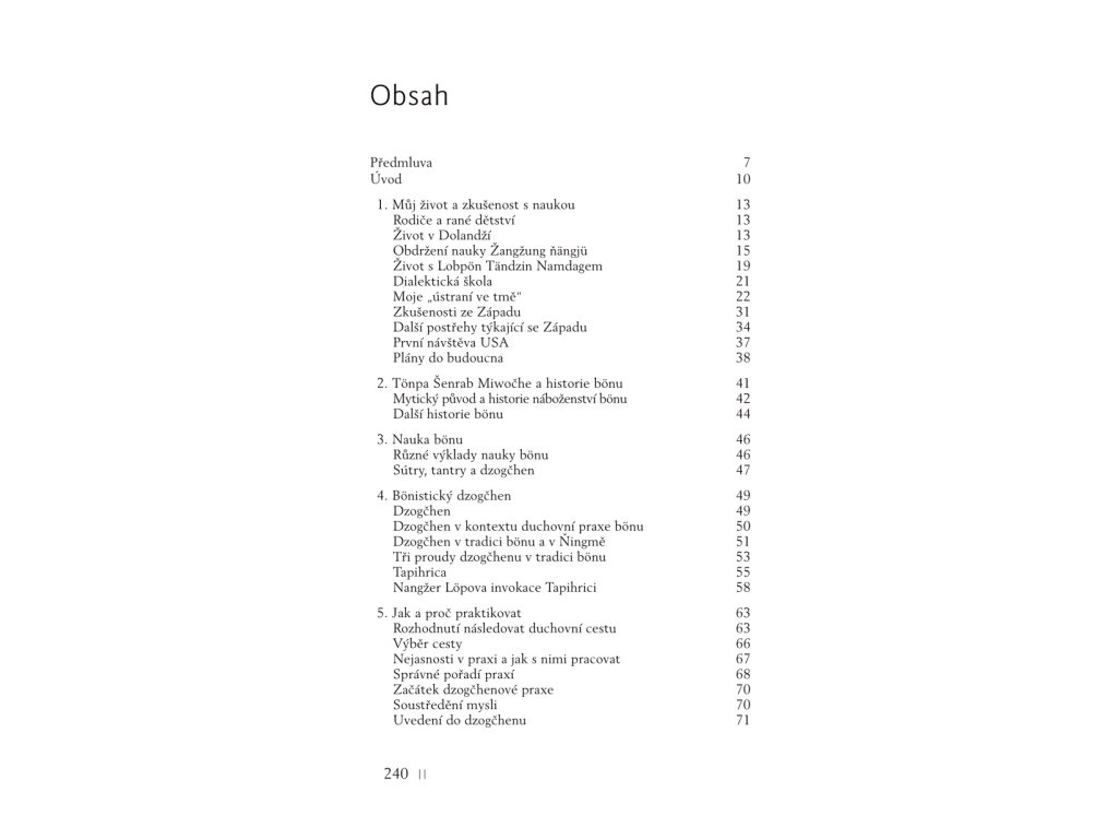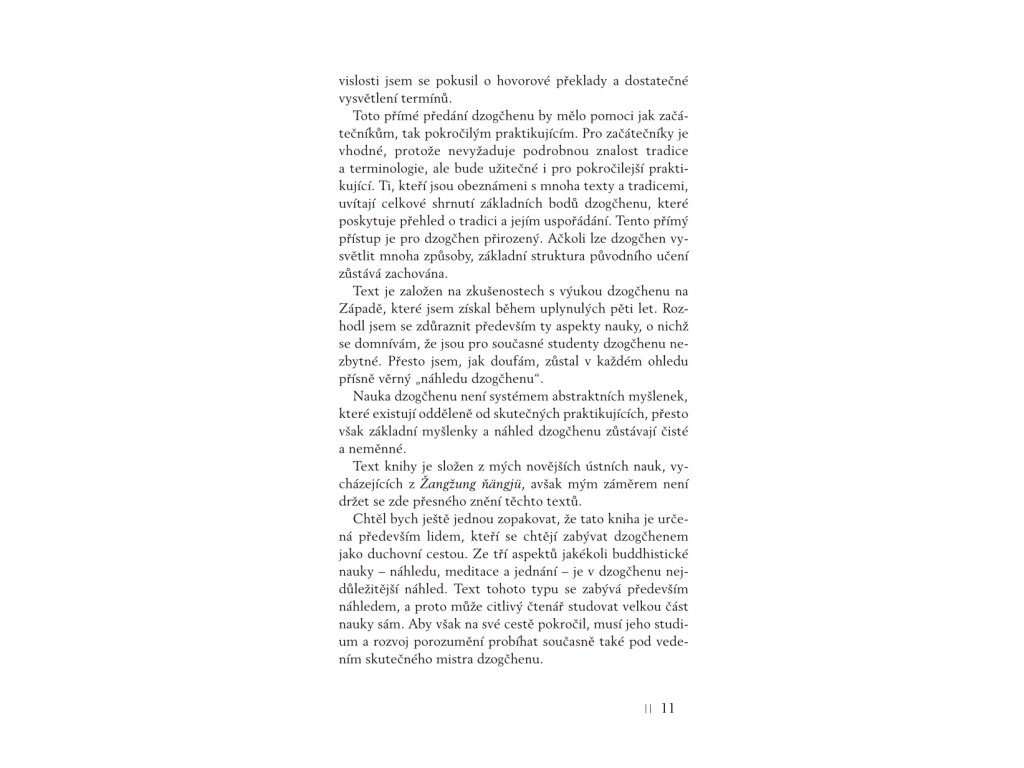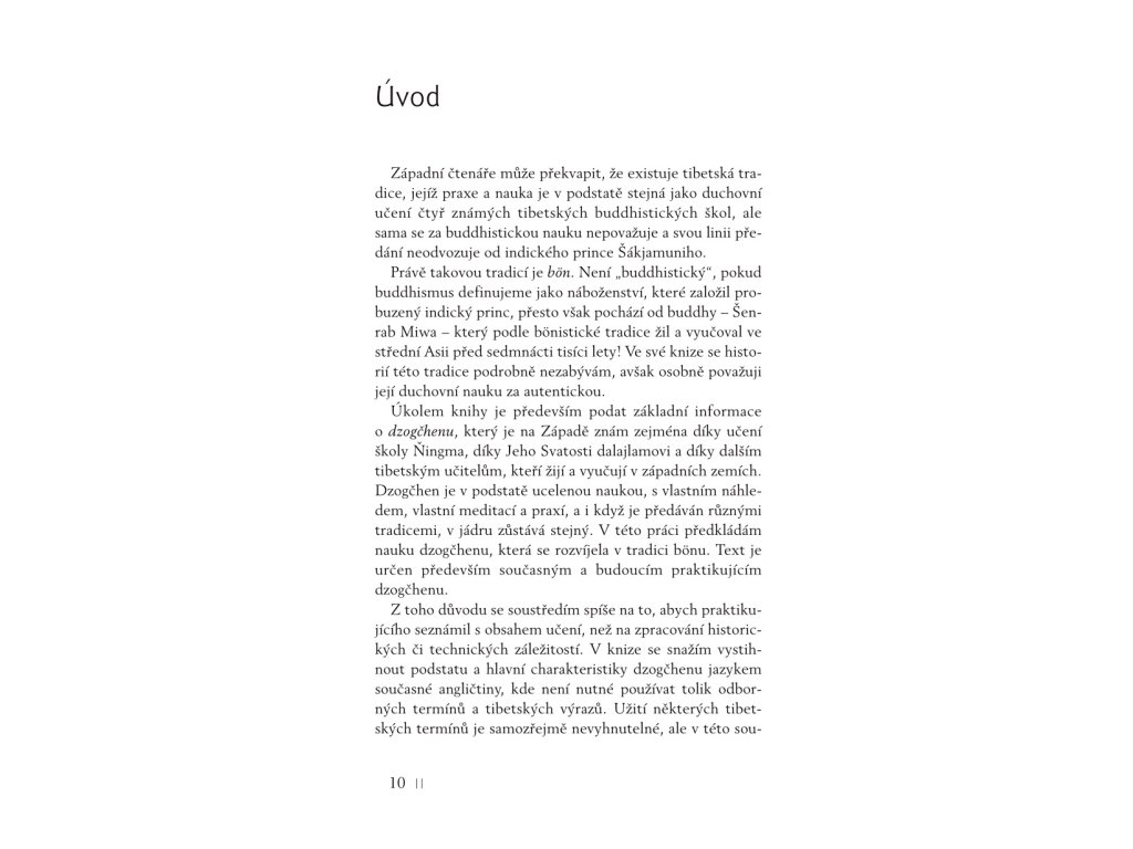 Kniha poprvé v češtině předkládá systematický přehled bönistického dzogčhenu podle jeho základního textu Žangžung ňängjü. Ten shrnuje hlavní charakteristiky nauky velké dokonalosti a objasňuje také její vztah k dalším systémům učení bönu.