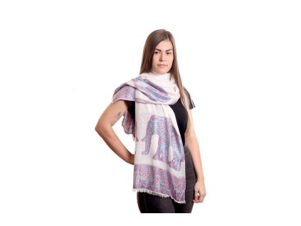 Elegantní heboučký a velmi lehký, bílý šátek z viskózy s modro růžovým vzorem slonů a květů. Krásný univerzální módní doplněk. Rozměry 69 x 102 cm. Země původu: Indie...