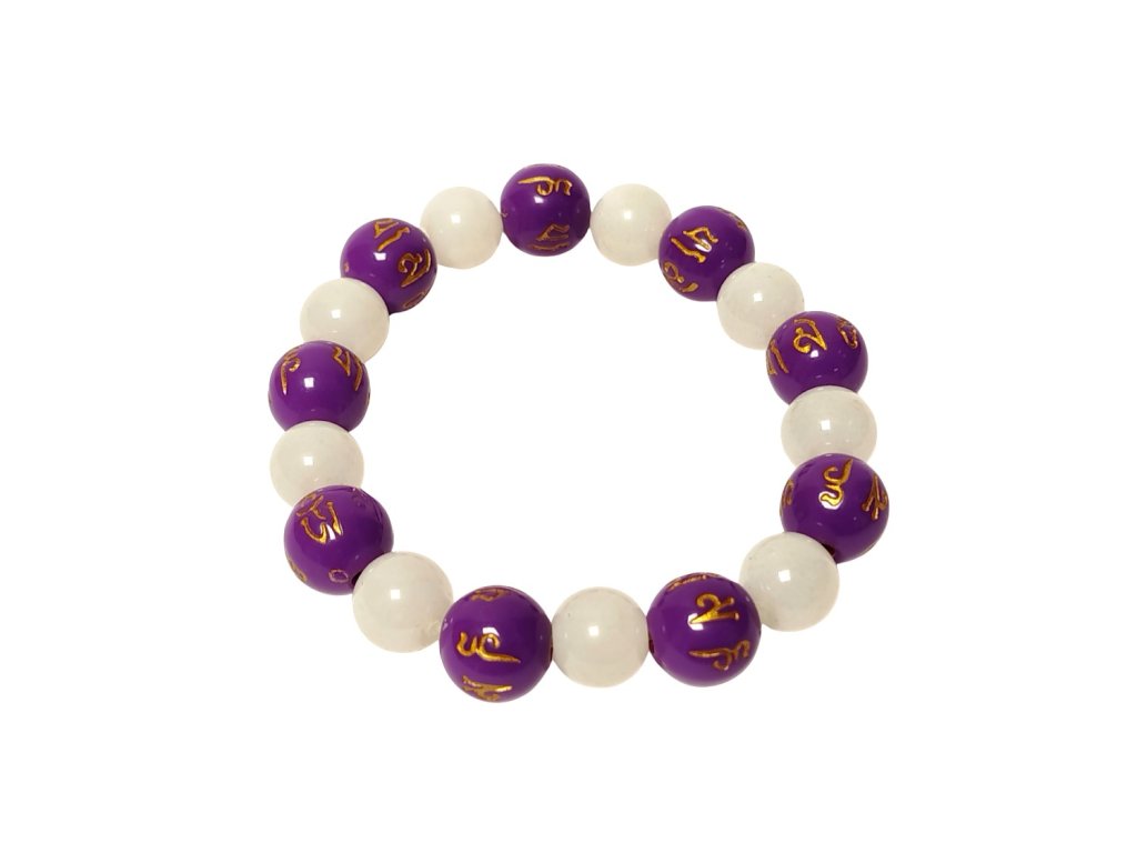 Obvod: cca 22 cm, průměr fialové kuličky: 1,2 cm, průměr bílé kuličky: 1 cm.