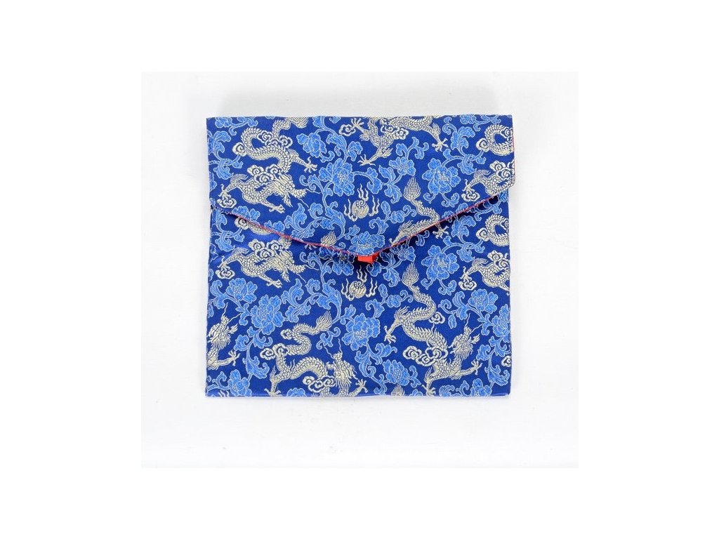 Brokátový obal na texty velikosti A5 zajistí elegantní ochranu pro vaše knihy. Vnitřní strana je z červeného plátna, vnější strana je z brokátu v tmavě modré barvě se vzorem s draky. Obal lze zafixovat červenou šňůrkou přišitou k přednímu cípu obalu.