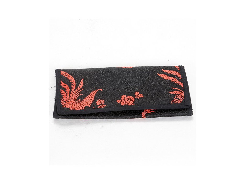 Černo-červená brokátová peněženka s tibetskými motivy. Peněženka má 7 kapes, dvě vnitřní jsou opatřeny pojezdovým zipem, celá peněženka je pak na suchý zip. Rozměry složené peněženky jsou 19 x 10 cm, rozložené pak 19 x 24 cm.