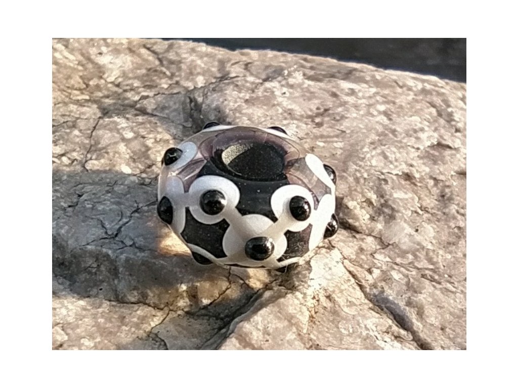 Skleněná perla s motivem geometrických čar, teček a koleček. Samostatně nebo v kombinaci s dalšími perlami utvoří originální šperk.