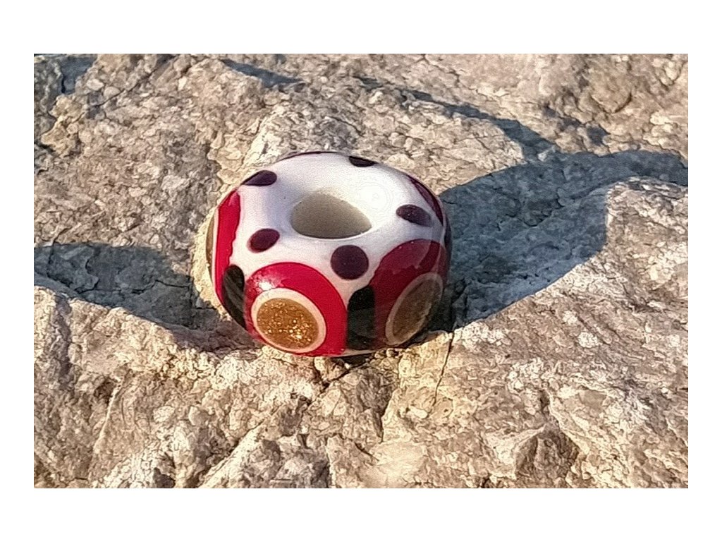 Skleněná perla s abstraktním motivem. Samostatně nebo v kombinaci s dalšími perlami utvoří originální šperk.