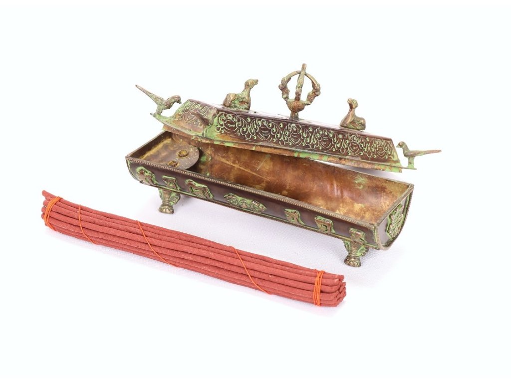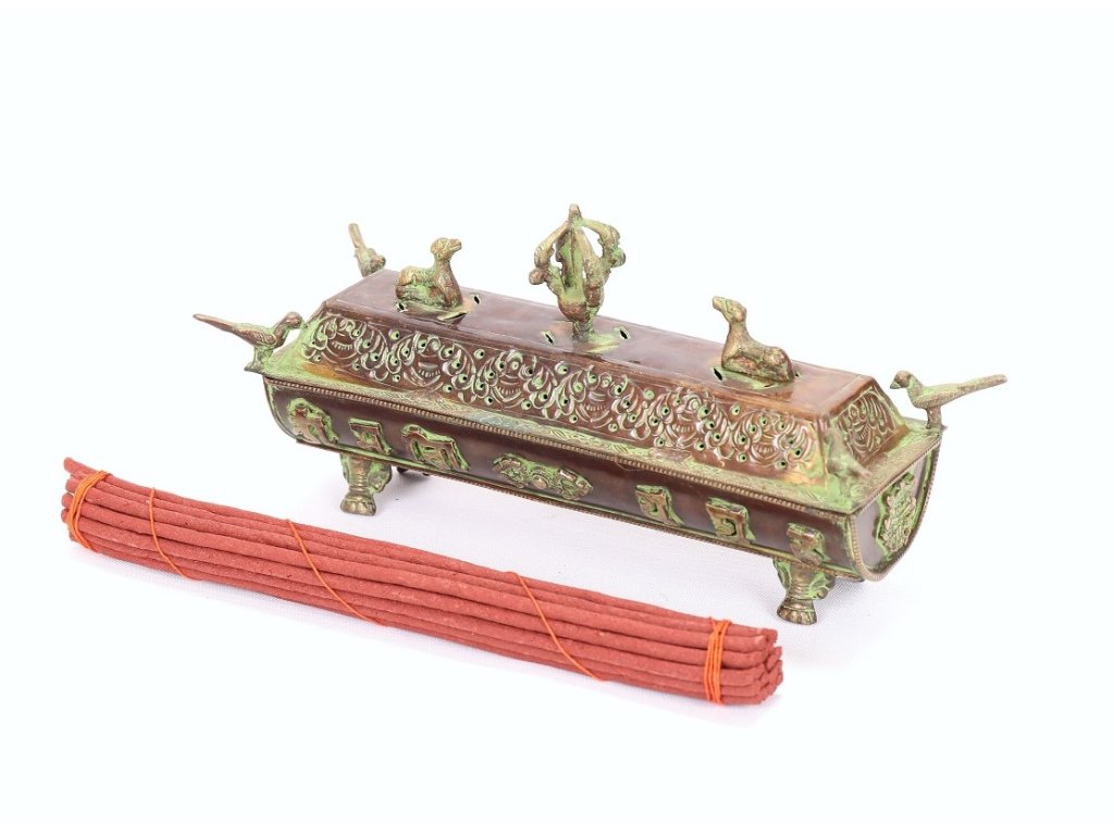 Kovový stojánek na vonné tyčinky s mantrou a zvířaty - zelený