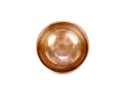 Nádherná, ručně tepaná tibetská mísa, zdobená, se zobrazením vševidoucích Buddhových očí. Ze spodní strany je pak zobrazena mantra Óm mani padme húm. Dominantní tón: C...