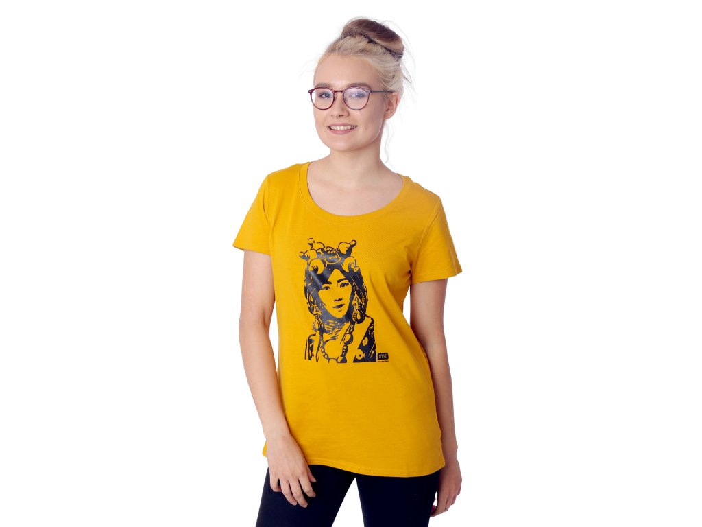 Žluté designové tričko odkazuje na tibetskou kulturu. Potisk s portrétem tibetské ženy navrhla Lenka Jasanská.