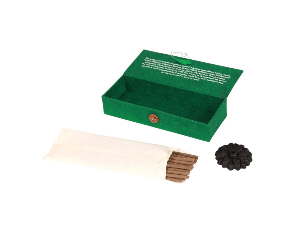 Toto jedinečné kadidlo kombinuje jalovcové bobule, zelené jalovcové listy, jantar, sladký chmel, kardamom, muškátový oříšek, hřebíček, šafrán, světlici barvířskou, gugul, santalové dřevo a 108 léčivých a aromatických rostlin, pečlivě sklizených v nedotčené himálajské oblasti. Kadidlo je ručně připravované tradičními tibetskými technikami a nabízí autentický a hluboce duchovní zážitek. Vytváří klidnou a povznášející atmosféru pro meditaci, modlitbu nebo každodenní relaxaci.